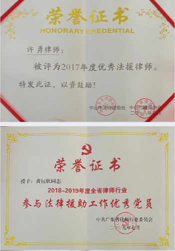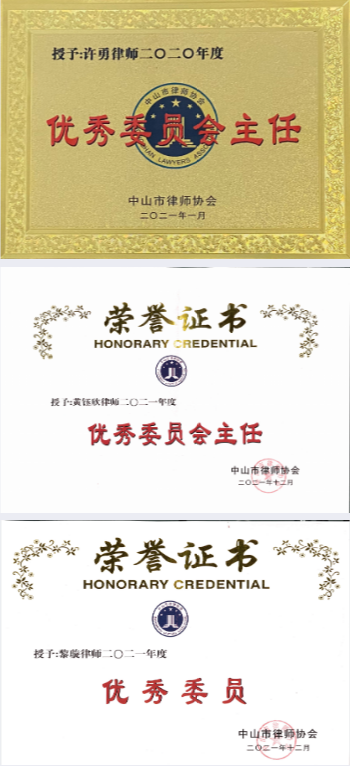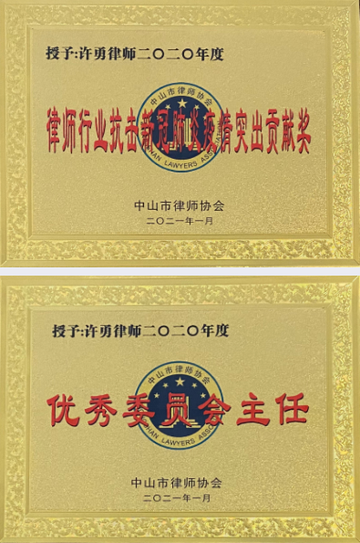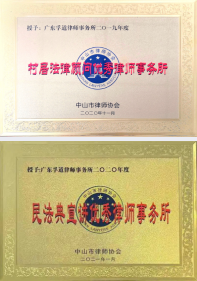 2020年,广东孚道律师事务所被中山市律师协会评为中山市“2019年度村居法律顾问优秀律师事务所”、“民法典宣讲优秀律师事务所”;广东孚道律师事务所党支部书记兼主任许勇律师荣获“2020年度律师行业抗击新冠疫情突出贡献奖”和“2020年度中山市律师协会优秀委员会主任”称号。