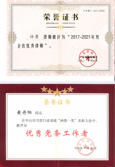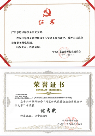 2021年,广东孚道律师事务所被广东省律师行业党委评为 “2020年度广东省示范化律师事务所党组织”,被中山市律师协会授予“湾区时代民营法律服务作品大赛”优秀奖。广东孚道律师事务所党支部书记兼主任许勇律师被广东省律师协会授予“2017-2021年度广东省优秀律师”,黄丹阳律师被授予“2021年度中山市司法行政系统优秀党务工作者”。