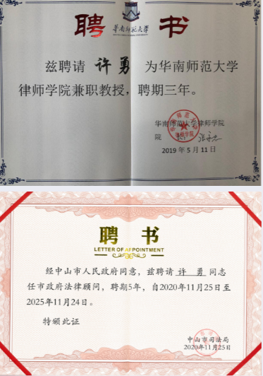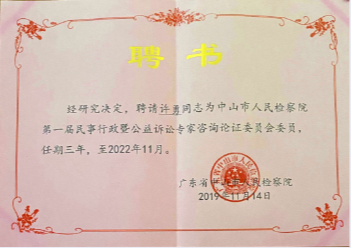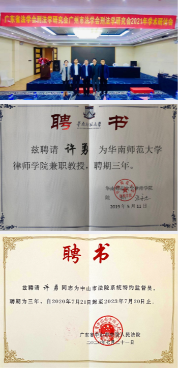 孚道律师积极与法律共同体互动交流,在力所能及的范围之内协助法院、检察院、仲裁委员会、法学会、律师学院等法律共同体开展相关工作。2020年至2021年,许勇等律师担任广东省法学会刑法学研究会理事,每年参加学术年会;担任华南师范大学律师学院兼职教授,多次向实习律师脱产培训班授课;担任中国广州仲裁委员会仲裁员,两年来参与10多件案件的裁决工作;担任中山市法院系统特约监督员和中山市人民检察院检察工作联络员,向法院和检察院提供提高司法效能、确保司法公正的意见和建议;担任中山市人民检察院民事行政暨公益诉讼专家咨询论证委员会委员,参加相关申诉案件专家听证工作。这些工作得到了法律共同体的充分肯定,同时也促进了法律共同体的互相理解,为营造良好的法治环境、促进司法公正作出了贡献。