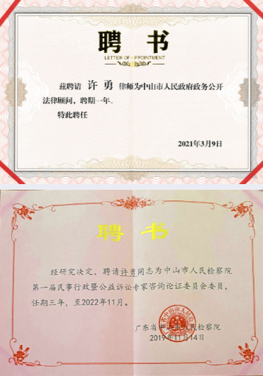 2020—2021年,孚道担任中山市人民政府、小榄镇人民政府、市应急管理局、市民政局等多个政府机关的常年法律顾问或专项法律顾问,担任人大代表和中山市政府规章规范性文件审查工作人才库成员,积极参与立法工作,协助政府开展重大决策合法性论证和法律风险评估,代理政府机关参加行政诉讼。相关工作举例如下:为《中山市关于进一步帮扶小微服务业企业做大做强的实施意见》等规范性文件出具修订意见或合法性审查意见;为《中山市国民经济和社会发展第十四个五年规划和二〇三五年远景目标纲要(草案)》进行合法性论证并出具法律意见书;就加快市属国有资本布局优化、结构调整和战略性重组的人大建议出具法律意见书;就中山市部分行政区划变更事项进行合法性审查并出具法律意见书;就应急管理局100多宗处罚决定进行事先合法性论证并出具法律意见;代理市政府应诉(行政诉讼)达500多宗;代理市应急管理局、水务局等政府机关应诉(行政诉讼)50多宗;担任小榄镇和沙溪镇人大代表,为当地的法治政府工作建言献策。在提供政府公共法律服务的过程中,孚道律师受到了政府部门的书面好评,许勇律师曾被市律协评为公共法律服务先进律师。