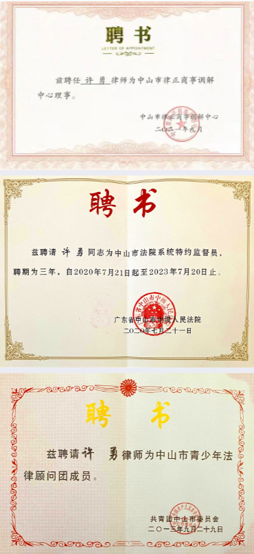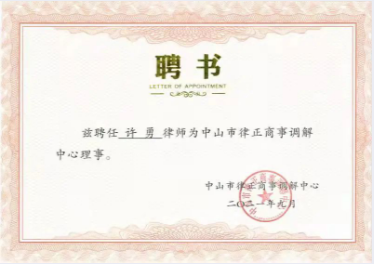 2021年9月,中山市司法局、中山市律师协会成立中山市律正商事调解中心,孚道许勇律师担任理事,充分发挥中山律师专业优势,拓宽服务领域,为中山本地以及国内外企业、机构的商事纠纷提供优质高效的调解服务,协助解决企业法律纠纷,维护和谐稳定的商事秩序。