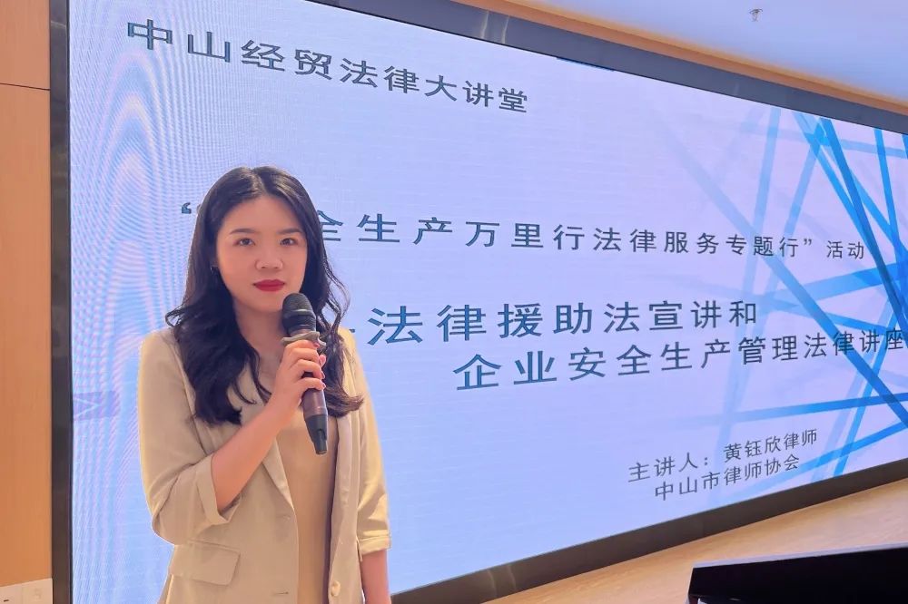省司法厅副厅长陈建、中山市副市长鲁罡、省商务厅相关领导、市商务局局长吴翘楚、市司法局局长王跃飞以及近40名中山企业代表参加揭牌仪式。启动仪式上,市商务局局长吴翘楚与市司法局局长王跃飞共同签署了湾区西岸(中山)经贸法律服务中心合作备忘录。在简单而隆重的安全生产万里行法律服务专题行启动仪式后,黄钰欣律师作为主讲嘉宾,向与会领导、企业代表开展了法律援助法、安全生产法重点亮点内容的专题讲座。