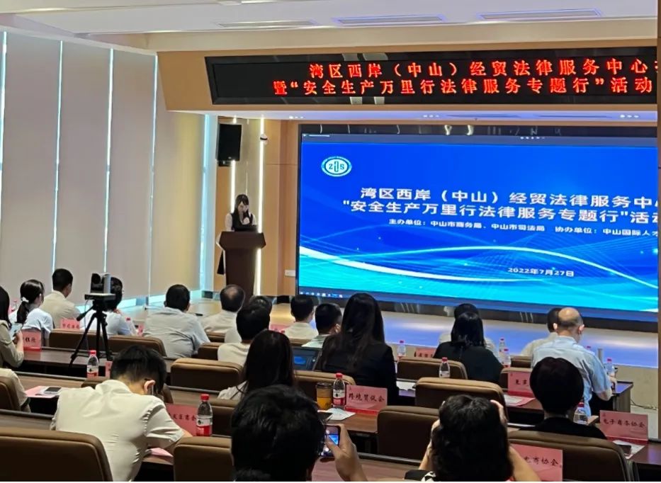 2022年7月27日上午,由中山市商务局、中山市司法局主办,中山国际人才港服务中心协办,中山市律师协会、中山市公证会、中山市司法鉴定协会承办的湾区西岸(中山)经贸法律服务中心揭牌暨安全生产万里行法律服务专题行活动于中山国际人才港(翠亨新区)举行启动仪式,孚道公共法律服务和行政诉讼部主任黄钰欣律师应主办单位之邀出席活动,并担任讲座环节的主讲嘉宾。