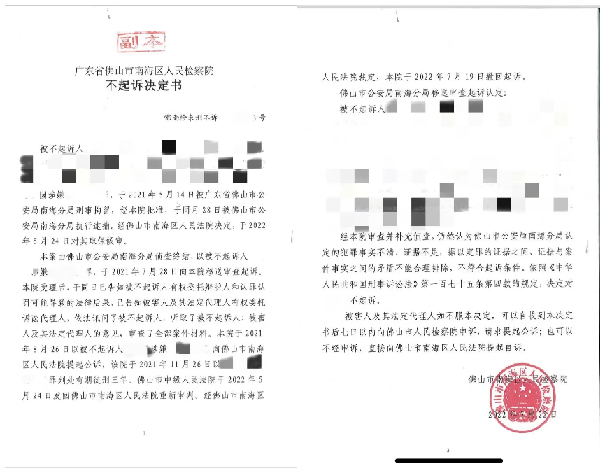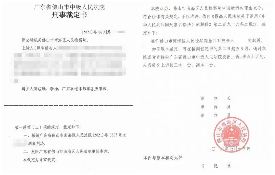 2022年5月13日本案二审正式开庭,在庭审中,陈炫臻律师、李杨律师的辩护观点引起了法庭的高度重视,抽丝剥茧式的辩护逐渐还原了案件真相。5月30日,二审法院作出裁定,认为本案事实不清、证据不足,裁定撤销原判,发回重审。6月6日,辩护人陪同H某的家属办理了取保候审手续,H某在被羁押一年多后终于闻到了自由的空气。7月13日,检察院撤回对H某的起诉,随后,检察院以犯罪事实不清,证据不足,据以定案的证据之间、证据与案件事实之间的矛盾不能合理排除为由,对H某作出不起诉决定。至此,历经一年两个月,案件终于尘埃落定,当事人也洗脱冤屈,重获清白和自由。