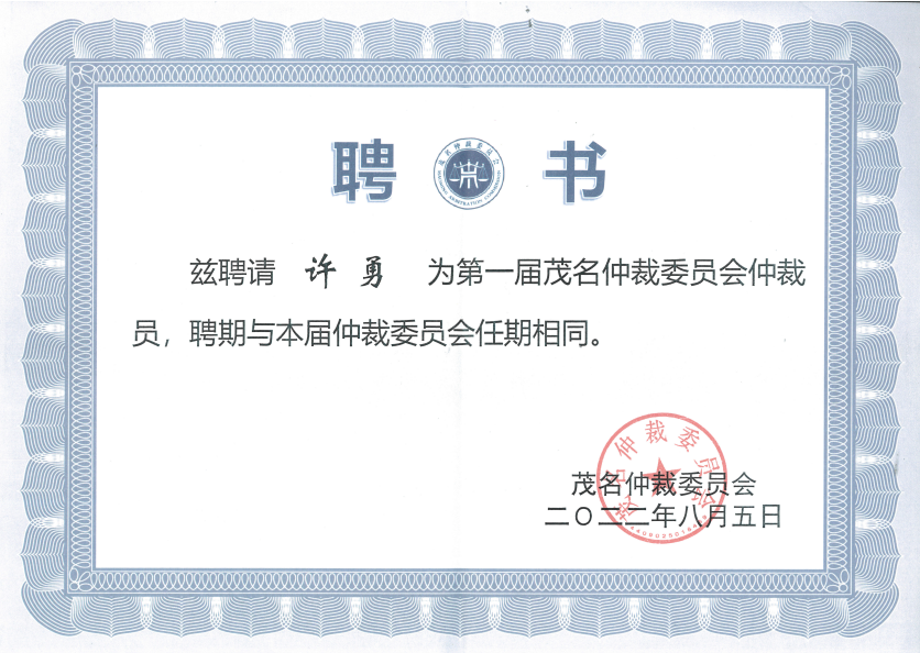许勇律师还同时担任广州仲裁委员会仲裁员、珠海国际仲裁院仲裁员,主持仲裁各类商事纠纷,有着丰富的仲裁经验。此次许勇律师受聘为第一届茂名仲裁委员会仲裁员,是商事仲裁机构对孚道律师专业水平的充分肯定。许勇律师将充分发挥专业特长,以提供公正、专业、高效、优质服务的争议解决方式为宗旨,公平、及时地为当事人提供仲裁服务,积极发挥好仲裁的社会效能。