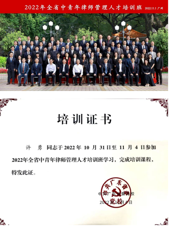 为深入学习贯彻习近平法治思想,贯彻落实习近平总书记关于律师工作的重要指示精神,进一步提升我省律师思想政治素养和综合素质,培养新时代广东律师行业高素质服务管理领军人才,推动广东律师事业高质量发展,2022年11月1日上午,省律师行业党委、省律师协会在省委党校举办以“学习贯彻党的二十大精神 做党和人民满意的好律师”为主题的全省中青年律师管理人才培训班。中共广东孚道律师事务所党支部书记、广东孚道律师事务所主任许勇律师被中山市律师协会推荐参加了本次培训班。