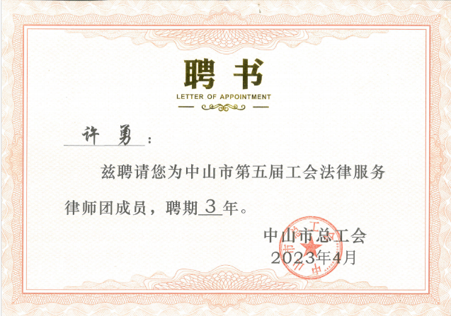 为进一步扩大律师服务平台,发挥法律工作者在促进和谐劳动关系方面的作用,经中山市总工会、中山市司法局、中山市律师协会研究决定,面向全市选聘中山市第五届工会法律服务律师团成员。经过一系列选聘程序,2023年4月25日,中山市总工会对中山市第五届工会法律服务律师团成员颁发聘书,孚道主任许勇律师受聘担任中山市第五届工会法律服务律师团成员,聘期 3 年。